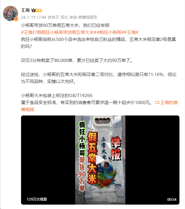 当日傍晚,知名打假人王海发布微博,举报疯狂小杨哥带货90万单假五常大米。王海称:“经过送检,小杨哥的五常大米和稻花香二号对比,遗传相似度只有71.16%,结论为不同品种,实锤以次充好。小杨哥大米包装上标注的GB/T19266,属于食品安全标准,有买到的消费者可要求退一赔十起步价1000元。”