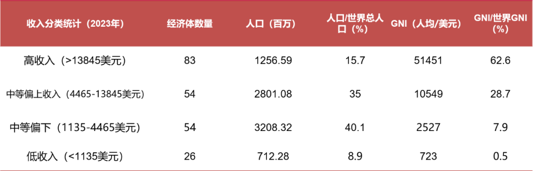 目前对高收入、中等偏上收入、中等偏下收入和低收入的分类,大家基本上都是依据世界银行的分类标准。从长期看,全球普遍存在各国货币超发、通胀等现象,故以美元计价的人均GNI同步提高确有必要。例如,2015年高收入国家和地区的门槛是人均11906美元,2023年则提高至13845美元,增加了近2000美元。而且,还得考虑全球贫富差距不断扩大的因素,让这收入四大分类中的所包含的人口数量相对合理。
