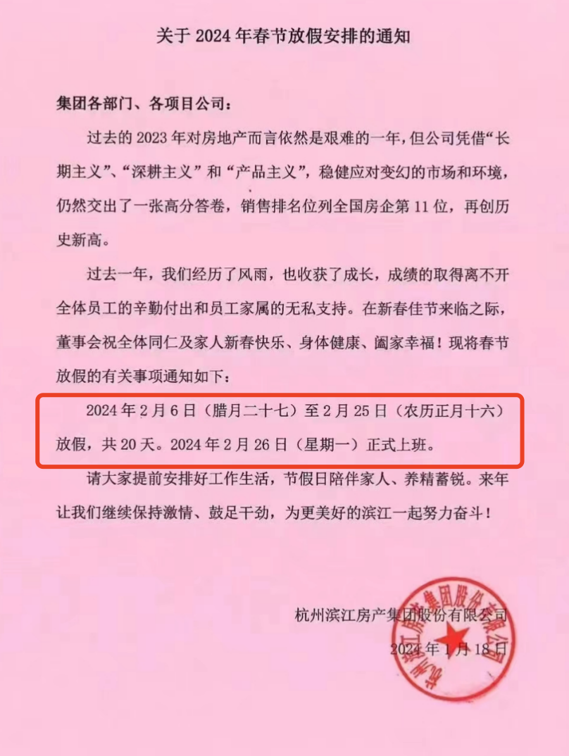 1月18日,“别人家的房企”滨江集团发布通知,宣布今年春节假期从2月6日放到2月26日,整整20天。