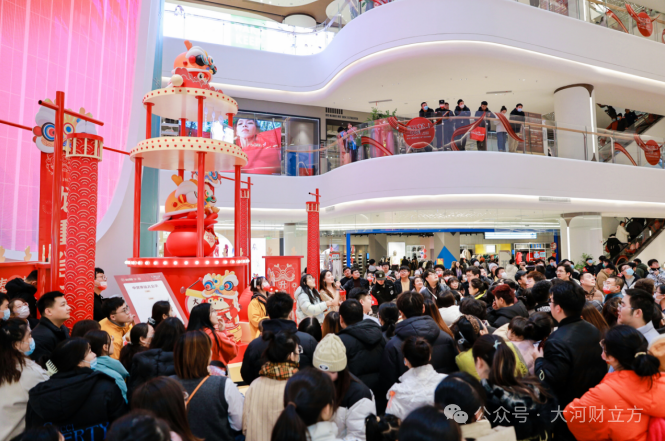 以“新年行龘运 祥瑞发财年”为主题的美陈设计,以及琳琅满目的年货街区拉满了年味儿。在商场中庭,一块充满科技感的动态大屏高居C位,成为最抢镜的“显眼包”。超大的春联、新年福袋、“出戏无界”潮流艺术展、DIY流体熊彩绘、《这是苹果吗》插画艺术特展等,不时传递出小惊喜,让沉寂了许久的360国贸店重新热闹非凡。