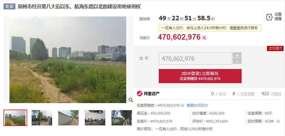 据郑州市中级人民法院发布的网络司法变卖公告,该地块拍卖底价4.71亿元,土地使用权面积为36404.6平方米(约54.6亩),不动产权证书号:豫(2017)郑州市不动产权第0001453号,使用期限:2017年1月10日起2057年1月9日止。本次司法拍卖的商品住房已纳入限购政策范围。