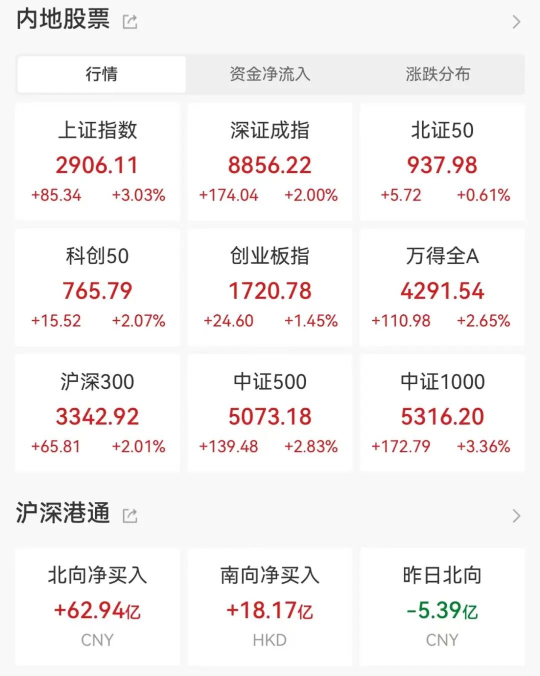 截至收盘,上证指数涨3.03%报2906.11点,创2022年3月以来最佳表现;深证成指涨2%,创业板指涨1.45%。A股全天放量成交9036.3亿元,创年内新高;北向资金净买入62.94亿元。