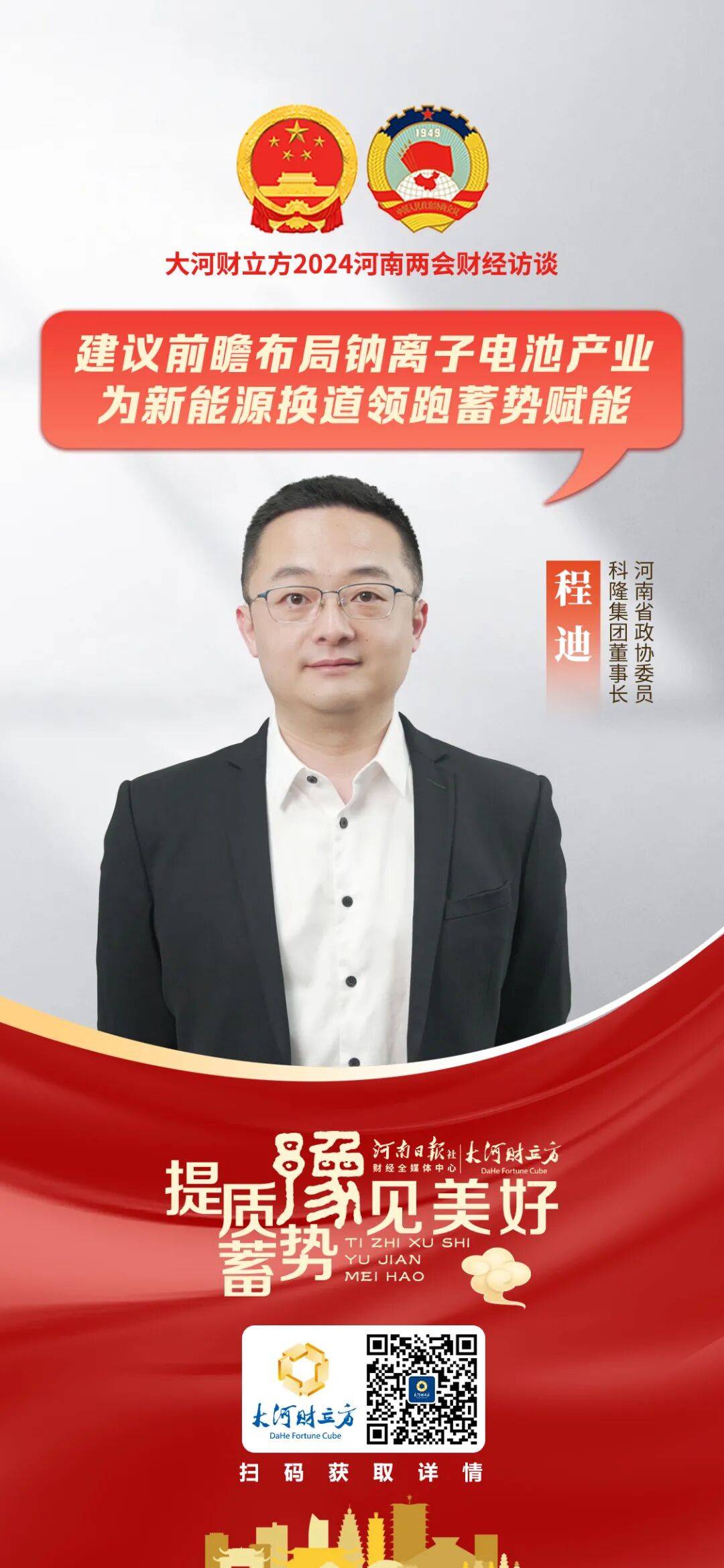 “锂电领域已经面临结构性产能过剩和价格红海,钠离子电池则正凭借其储量丰富、低成本、长寿命等优势迅速崭露头角。”2024年河南两会期间,省政协委员、科隆集团董事长程迪在接受大河财立方记者专访时表示,建议河南持续推动钠离子电池发展体系建设,为我省经济发展培育新的增长点。