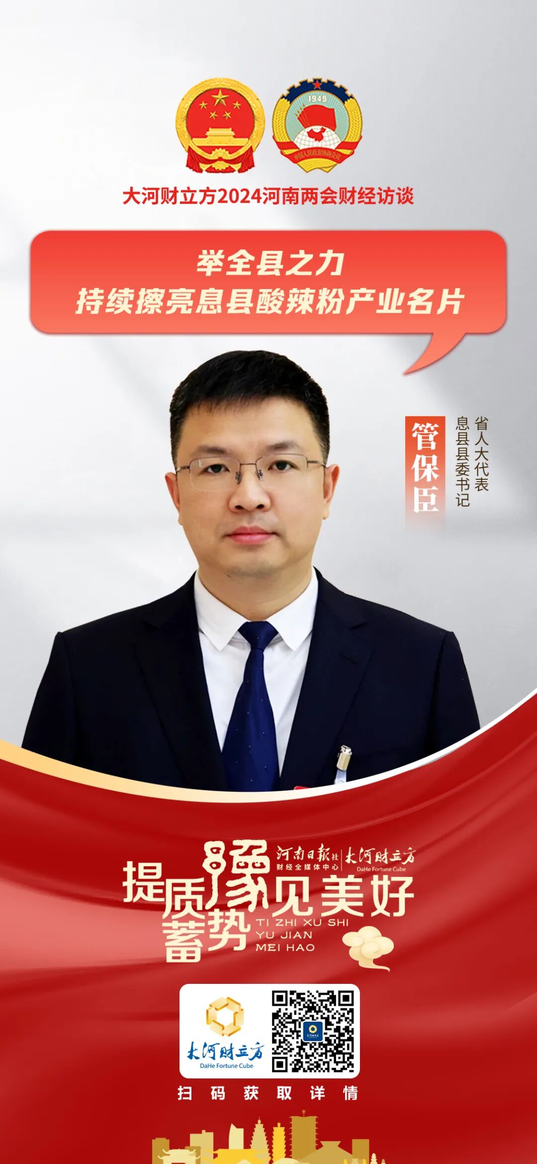 2024年河南省两会期间,省人大代表、息县县委书记管保臣接受大河财立方记者专访时表示,要做优品质、做强龙头、做精品牌,息县将举全县之力持续擦亮息县酸辣粉产业名片。