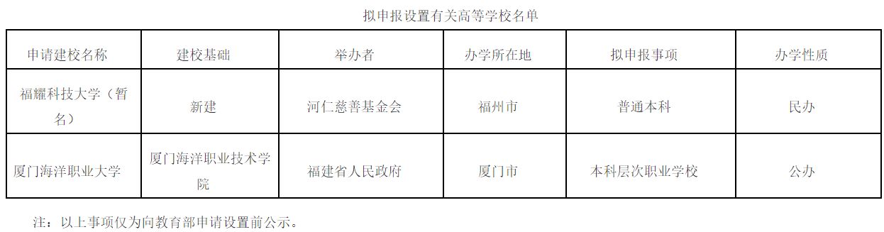【大河财立方消息】1月29日,福建省教育厅发布关于高等学校设置事项的公示,经福建省高等学校设置评议委员会专家考察和评议,拟向教育部申报设立福耀科技大学(暂名)等2所高校。