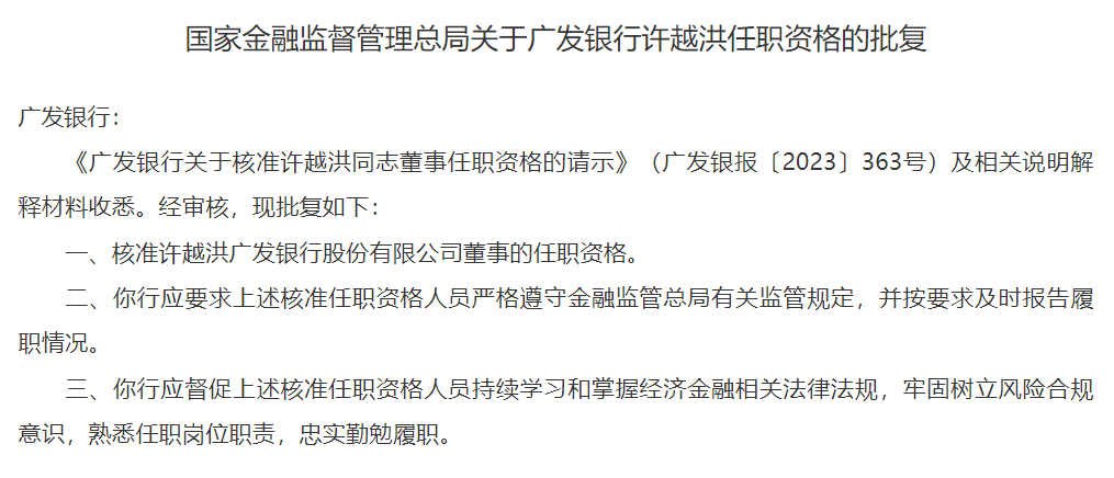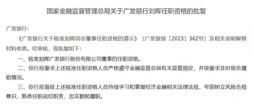 1月30日,国家金融监督管理总局披露公告,核准刘晖、许越洪广发银行股份有限公司董事的任职资格。