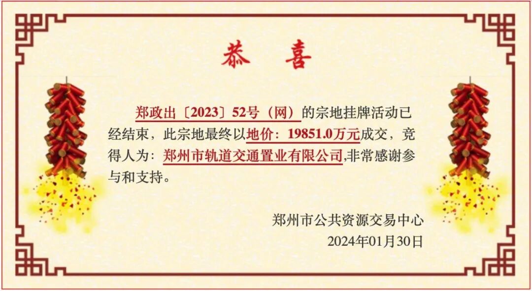 郑政出〔2023〕52 号(网)地块被郑州市轨道交通置业有限公司以19851万元摘得,溢价率0%。