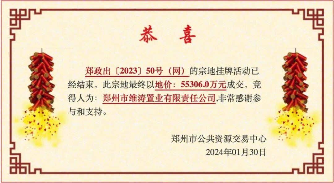 郑政出〔2023〕50 号(网)地块被郑州市维涛置业有限责任公司55306万元摘得,溢价率0%。该公司由郑州建中建设开发(集团)有限责任公司100%持股,实际控制人为郑州市管城回族区财政局。