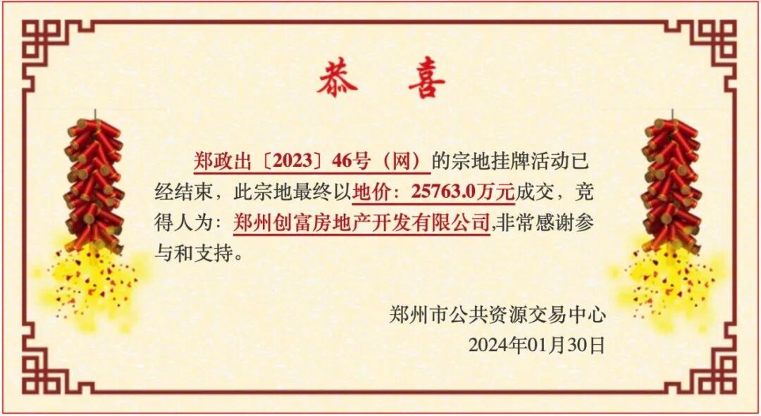 郑政出〔2023〕46 号(网)地块被郑州创富房地产开发有限公司25763万元摘得,溢价率0%。该公司为河南亚星置业集团有限公司控股子公司。