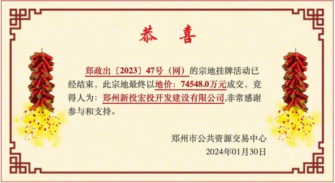 郑政出〔2023〕47 号(网)地块被郑州新投宏投开发建设有限公司74548万元摘得,溢价率0%。该公司由郑州二七投资控股有限公司100%持股,实际控制人为郑州市二七区国有资产事务中心。