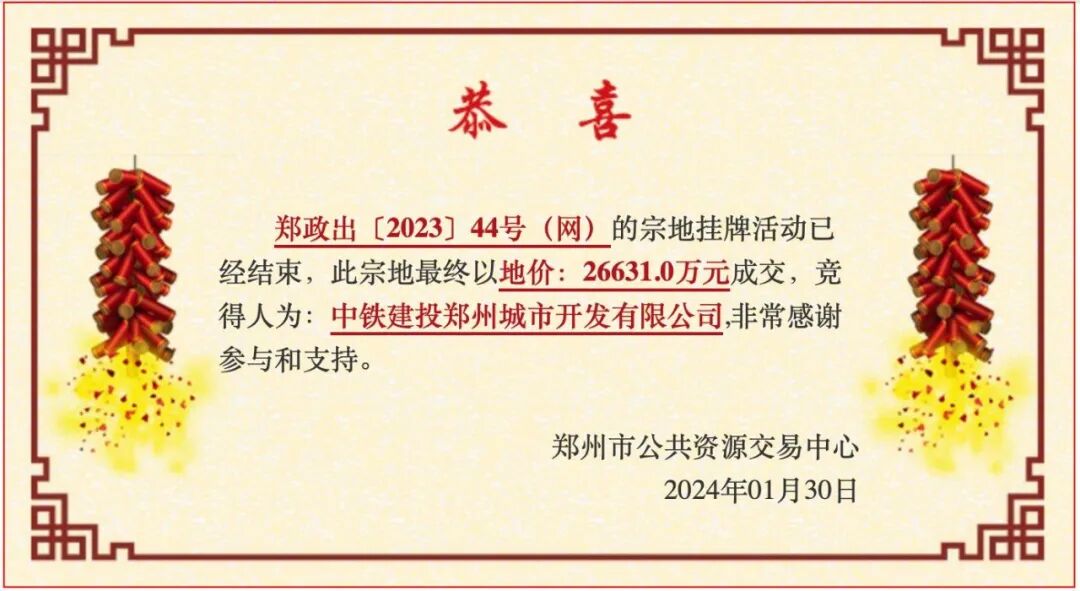郑政出〔2023〕44 号(网)地块被中铁建投郑州城市开发有限公司以26631万元摘得,溢价率0%。