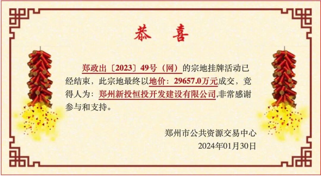 郑政出〔2023〕49 号(网)地块被郑州新投恒投开发建设有限公司29657万元摘得,溢价率0%。该公司由郑州二七投资控股有限公司100%持股,实际控制人为郑州市二七区国有资产事务中心。