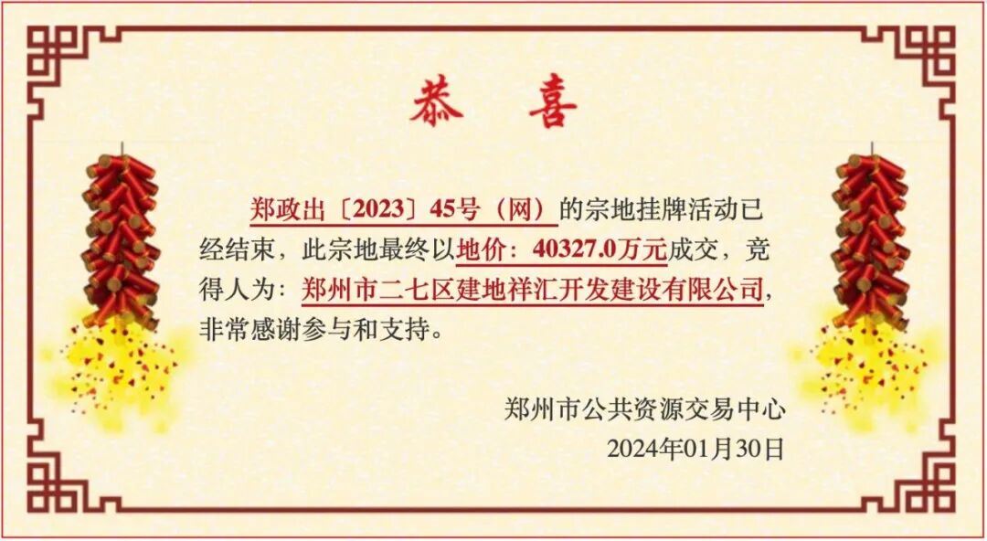 郑政出〔2023〕45 号(网)地块被郑州市二七区建地祥汇开发建设有限公司40327万元摘得,溢价率0%。该公司由郑州二七投资控股有限公司100%持股,实际控制人为郑州市二七区国有资产事务中心。