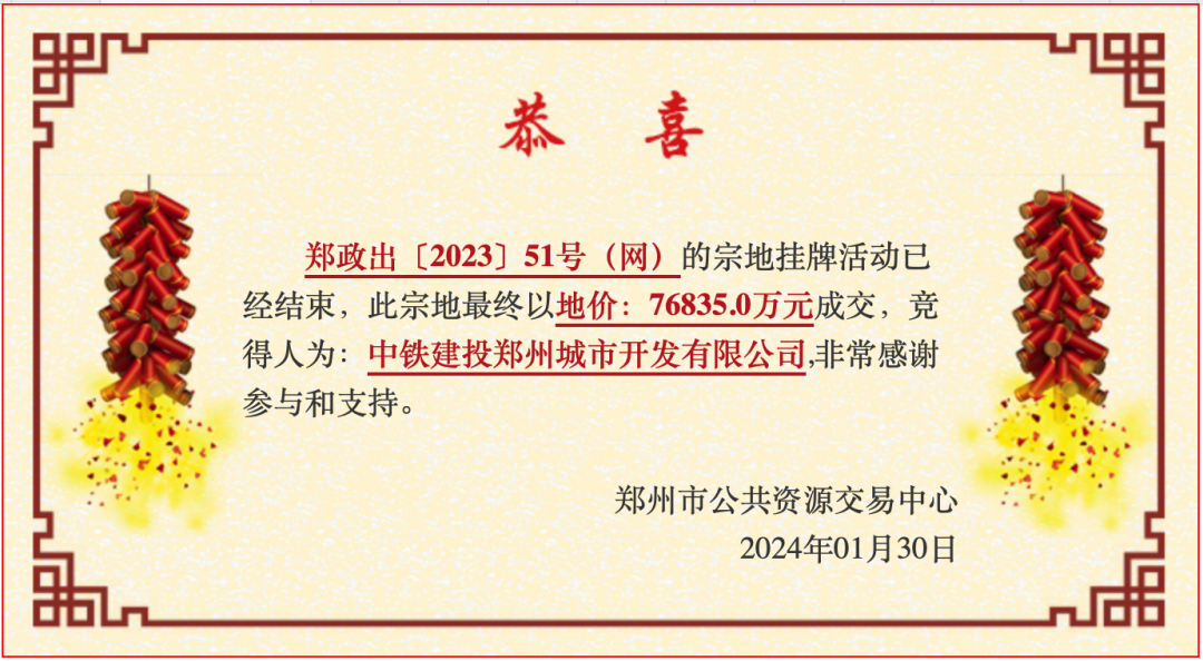 郑政出〔2023〕51 号(网)地块被中铁建投郑州城市开发有限公司以76835万元摘得,溢价率0%。