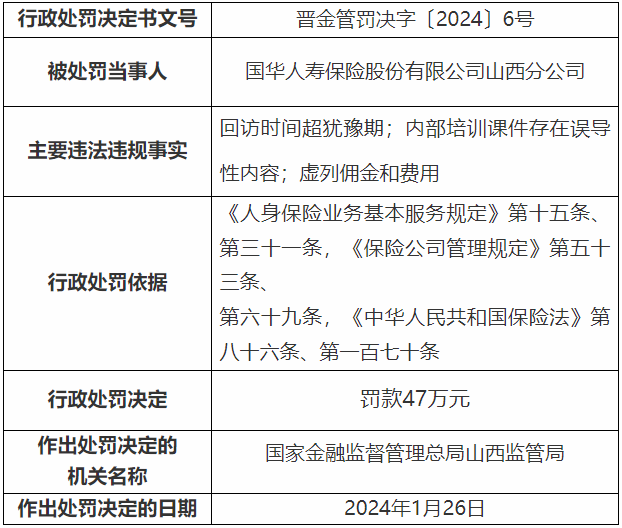 【大河财立方消息】1月31日,国家金融监管管理总局山西监管局披露行政处罚信息显示,因回访时间超犹豫期、内部培训课件存在误导性内容、虚列佣金和费用,国华人寿保险股份有限公司山西分公司被罚款47万元。
