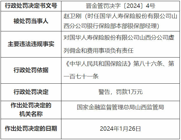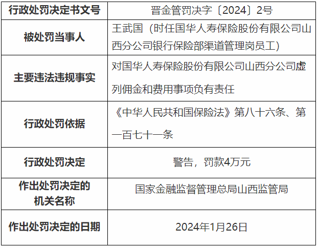 时任国华人寿山西分公司银行保险部渠道管理岗员工王武国,对国华人寿山西分公司虚列佣金和费用事项负有责任,被处以警告,并罚款4万元。