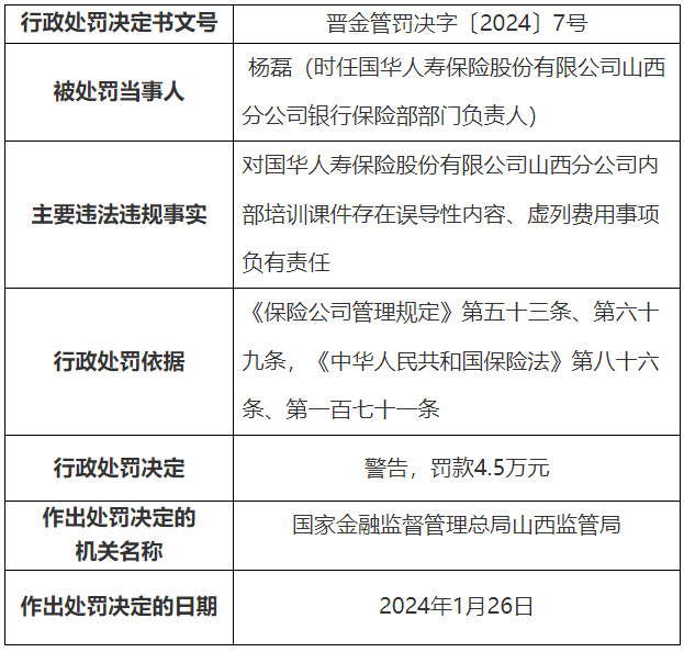 时任国华人寿山西分公司银行保险部部门负责人杨磊,对国华人寿山西分公司内部培训课件存在误导性内容、虚列费用事项负有责任,被处以警告,并罚款4.5万元。