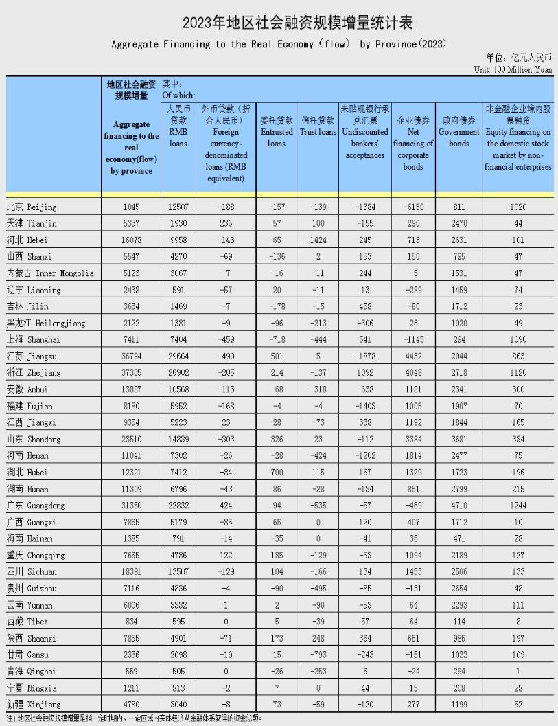 央行公布2023年各地区社融增量,浙江、江苏、广东超3万亿元