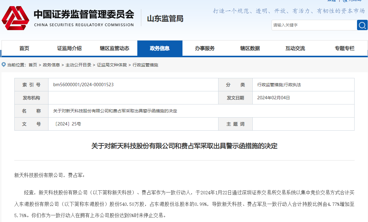 【大河财立方消息】2月6日消息,增持东港股份达到举牌线时,未停止交易,新天科技及其实控人之一费占军收到深交所下发监管函之后,又被山东证监局出具警示函。