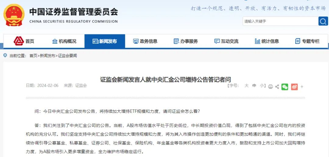 问:今日中央汇金公司发布公告,将持续加大增持ETF规模和力度,请问证监会怎么看?