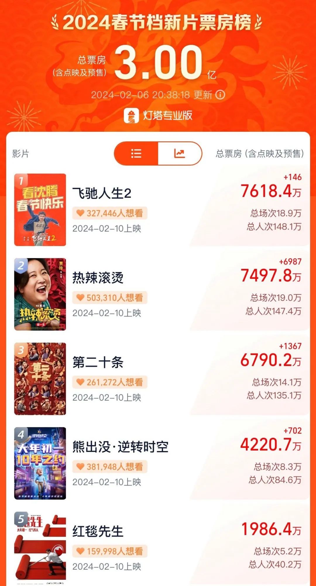 据灯塔专业版,截至2月6日20时38分,2024春节档总票房突破3亿元,《飞驰人生2》《热辣滚烫》《第二十条》三部影片并驾齐驱,暂列预售票房前三位,票房分别达到7618.4万元、7497.8万元、6790.2万元。