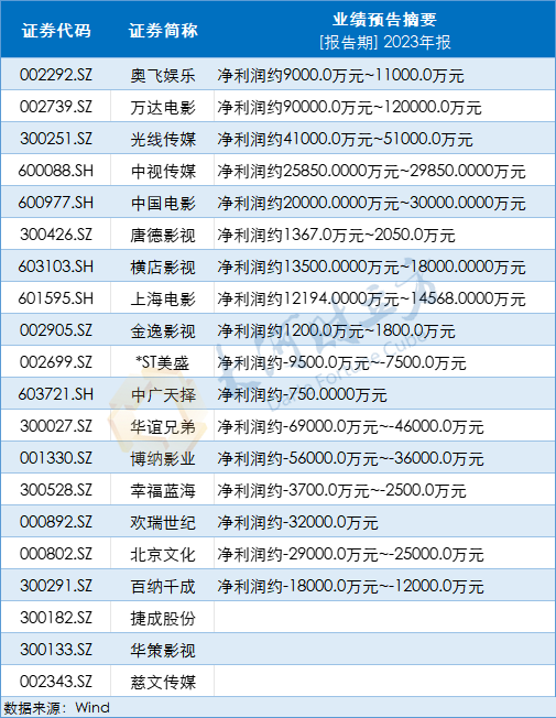 Wind显示,20家影视院线上市公司中,17家已经公布2023年业绩预告,其中9家公司成功扭亏。