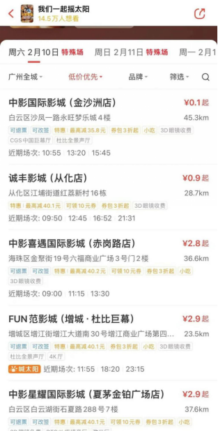 在预售首日,有网友发现《我们一起摇太阳》在广州一些影院甚至放出了叠加平台优惠后不足1元的“白菜”票价。
