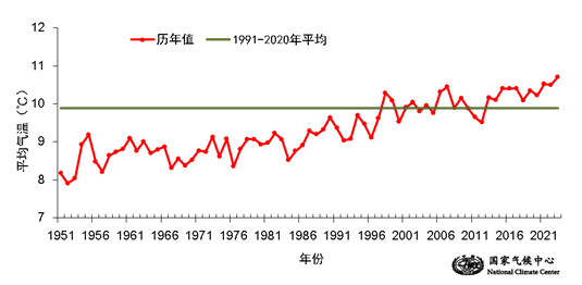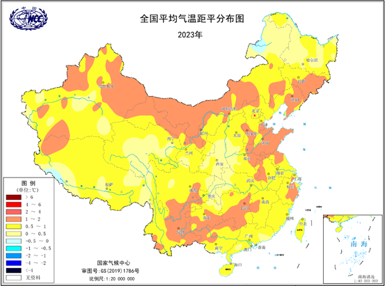 在气温方面,2023年全国平均气温为10.71℃,较常年偏高0.82℃,为1951年以来历史最高。全国平均高温日数较常年偏多4.4天,为1961年以来第二多。