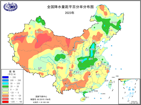 2023年全国降水量距平百分率分布(单位:%)