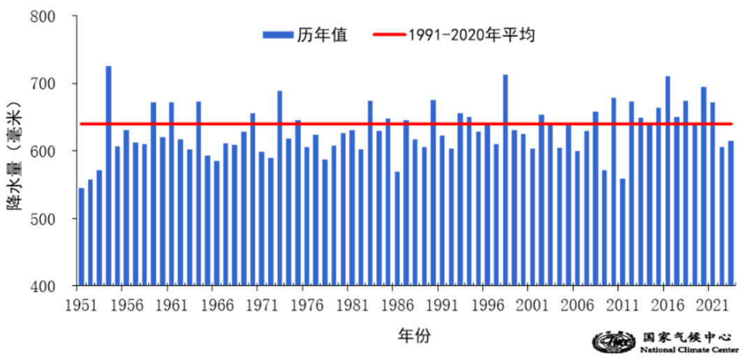 1951年至2023年全国平均降水量历年变化(单位:毫米)