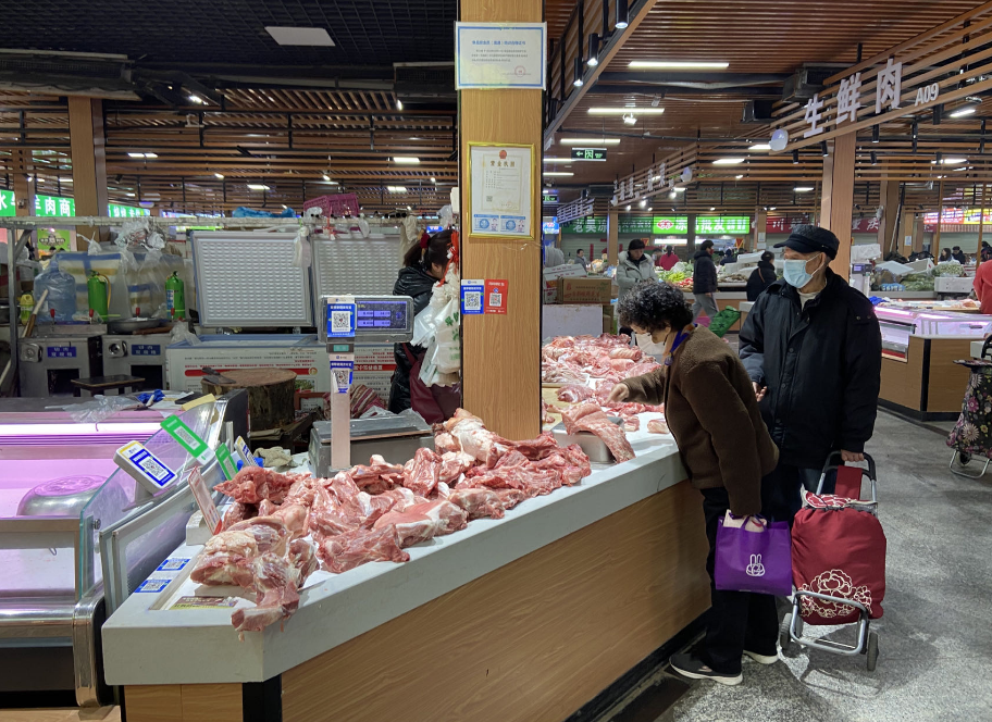 在一家猪肉摊位前,爷孙俩一个介绍价格,一个忙着分装顾客购买的猪肉。商户刘先生告诉记者,孙子今年上初二,作业写完了主动要来帮忙,前腿肉、后腿肉、猪蹄都是什么价格都记得十分清楚,两个人搭配干活效率高了不少。