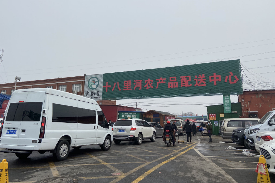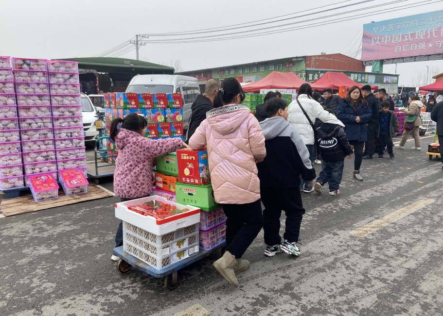 过年除了可口的饭菜,新鲜的水果也是必不可少。在十八里河农产品配送中心,沿路通往农贸市场的车辆穿梭不停。市场里拉货的推车来来往往,每一辆小推车都堆得满满当当。在这里,除了来进货的商超老板,不少顾客都是一家人一起前来采购水果。