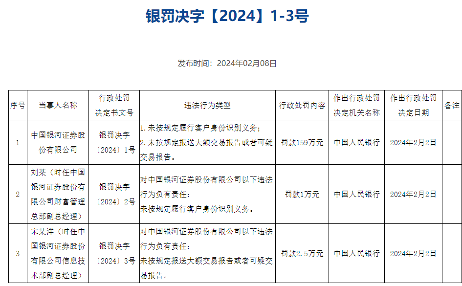 【大河财立方消息】2月8日,中国人民银行披露处罚信息显示,因未按规定履行客户身份识别义务,未按规定报送大额交易报告或者可疑交易报告,中国银河证券股份有限公司被罚款159万元。