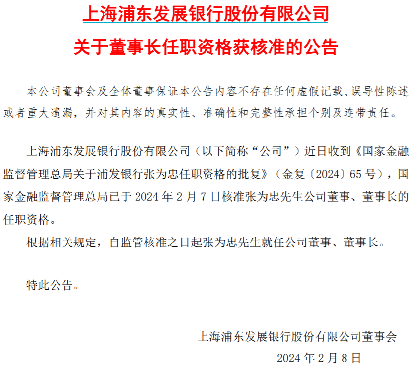 【大河财立方消息】2月8日,浦发银行发布公告称,近日收到《国家金融监督管理总局关于浦发银行张为忠任职资格的批复》,国家金融监督管理总局已于2月7日核准张为忠浦发银行董事、董事长的任职资格。