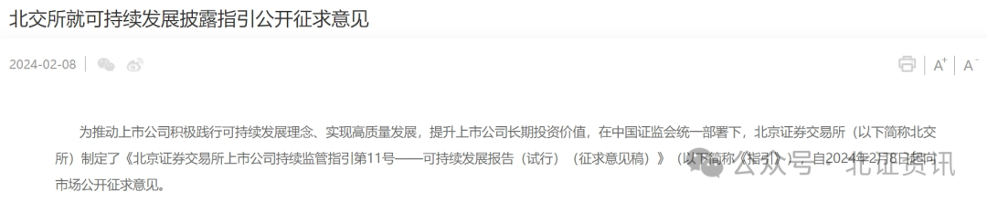 2月8日,在中国证监会统一部署下,北交所制定了《北京证券交易所上市公司持续监管指引第11号——可持续发展报告(试行)(征求意见稿)》(以下简称《指引》),自当天起向市场公开征求意见,北交所表示,下一步将持续推动创新型中小企业深入贯彻落实新发展理念、积极推动转型升级,提升上市公司市场认可度,为构建新发展格局、推动高质量发展积极贡献力量。