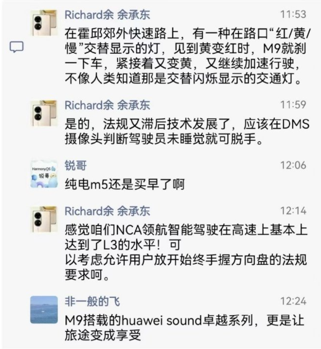 此外,余承东还在评论区吐槽说,“法规又滞后技术发展了,应该在DMS摄像头(驾驶员监控系统的缩写)判断驾驶员未睡觉就可脱手。”