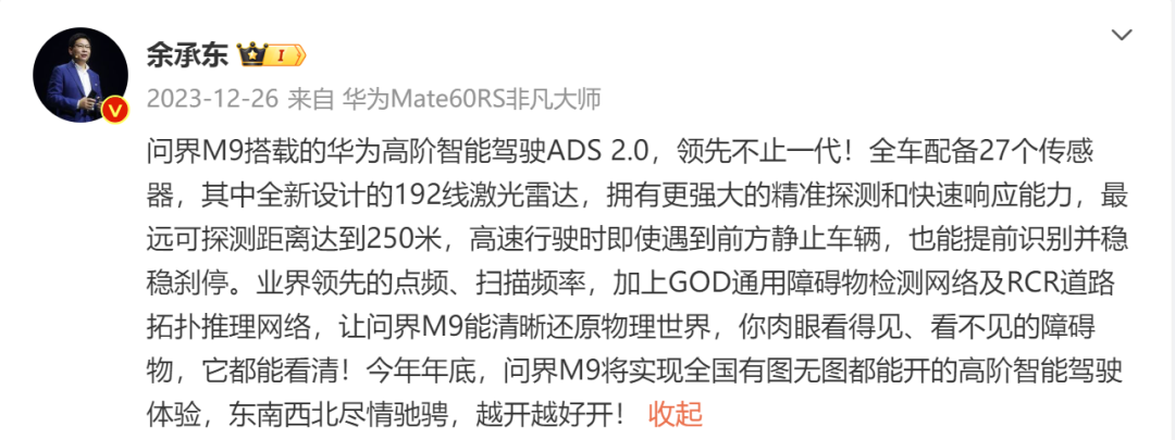 余承东曾经发文,问界M9搭载的华为高阶智能驾驶ADS2.0,领先不止一代!