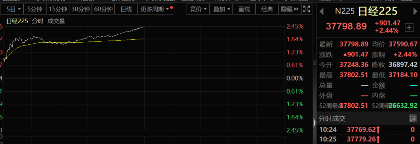 今天早盘,日本股市亦大幅飙升,续创1990年以来新高。
