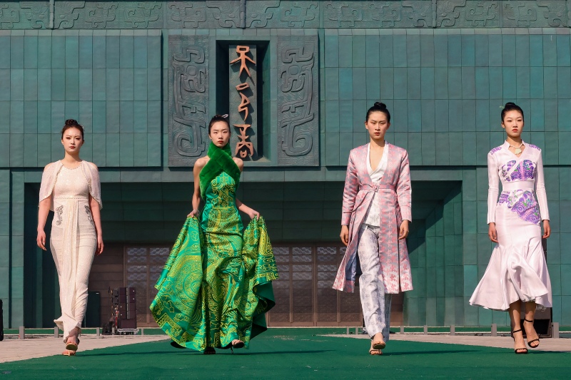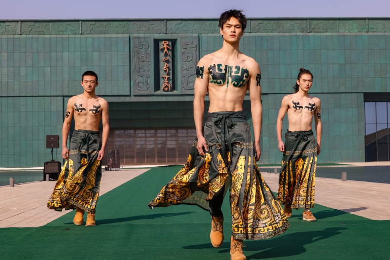 时装展演以气势恢宏的殷墟博物馆为舞台,让历史与时光相聚,青铜与时装相融,磅礴大气中兼具细腻之美。模特们身穿传统文化与现代元素完美融合的时装款款而来,传承国风服饰的盛大与华丽,展示伟大的商文明。一件件衣摆和裙裾之上的云雷纹饰象征着太阳与云雷共存于天际,体现着祖先对自然世界的描绘和向往。这是“熔金凝华”系列,以殷墟的青铜器为灵感来源,通过精致的剪裁和独特的色彩搭配,展现出青铜器的厚重历史感和现代时装的轻盈飘逸,形成强烈的视觉冲击力。“活力绽放”系列以殷墟的自然环境和生机勃发的景象为灵感,“玉佩琼琚”系列是从殷墟出土的玉器纹饰中汲取灵感,“萃图成字”系列则是将甲骨文元素巧妙融入时装设计中,还有“凤归洹滨”和“山海无拦”系列,每一个针脚都是匠人心血的结晶,每一个图案都是文化传承的见证。