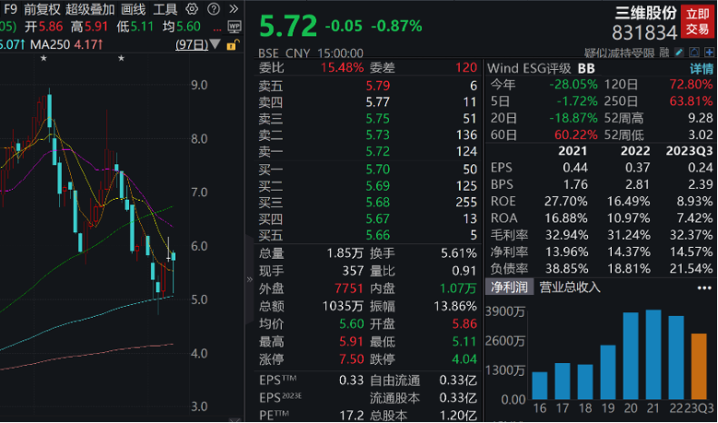 北交所个股三维股份解禁比例居首,为72.53%。2023年11月至今,该股股价持续大幅上涨,累计涨幅为70.24%,其间最大涨幅超过165%。公司主营散状物料输送机械零部件产品的研、产、销,主要服务于粮油、饲料加工储运等领域。公司客户覆盖布勒机械、捷赛股份等粮食输送机械制造龙头企业,以及中储粮、正大集团、新希望、益海嘉里等集团化终端用户。