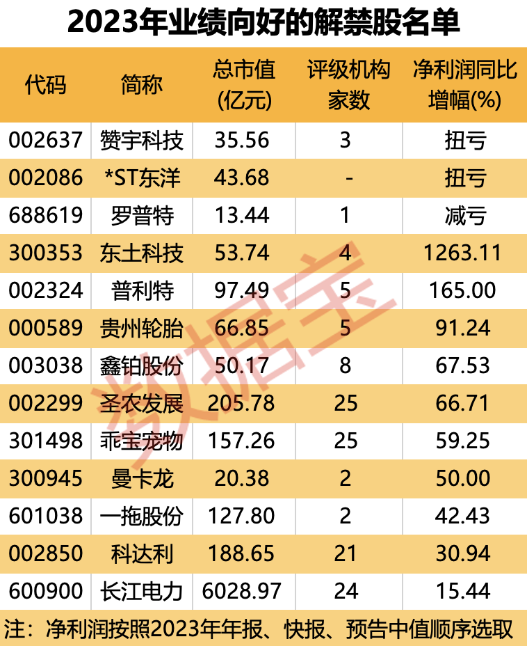 以2023年年报、快报或预告区间中值统计,在上述85只解禁股中,2023年净利润同比增幅逾10%的共计13只。其中东土科技居首,增幅高达1263.11%;普利特也翻倍,增幅为165%。