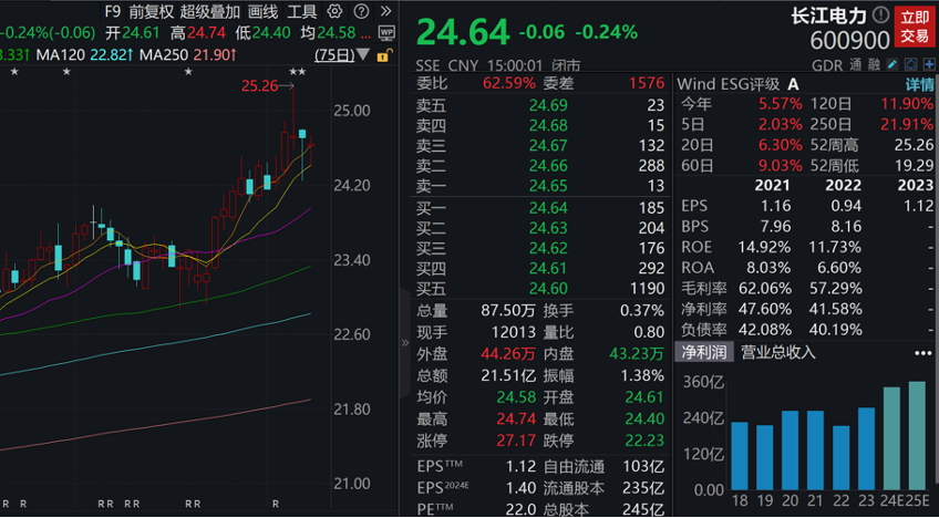 长江电力为全球水电龙头。根据2023年业绩快报,公司实现营收780.62亿元,同比增长13.36%;归母净利润273.89亿元,同比增长15.44%,业绩增长主要系公司六座梯级电站发电量同比增加140.15亿千瓦时所致。2月6日盘中,该股股价创下历史新高,一度达到25.26元/股,最新收盘价为24.64元/股。