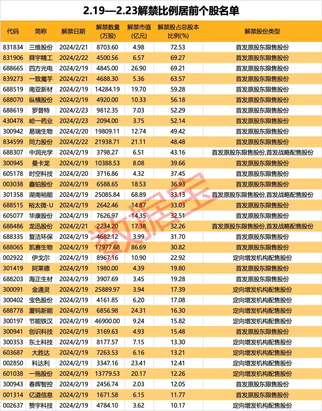 证券时报·数据宝统计,龙年首周(2月19日至23日),A股市场将有85家上市公司迎来限售股解禁。以个股最新价计算,解禁股对应市值合计695.41亿元。