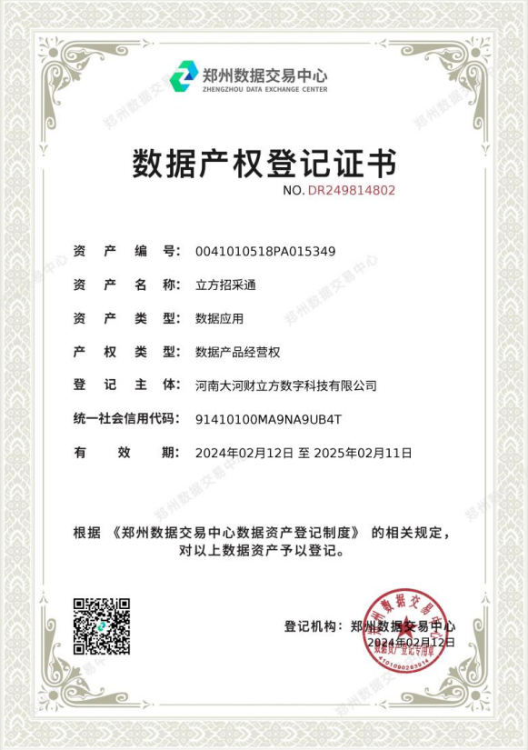 【大河财立方 记者 李铮 实习生 李雯雯】开门红!龙年春节期间,河南大河财立方数字科技有限公司(以下简称财立方数科)两项数据应用产品“财金先生”和“立方招采通”通过公示,获得“数据产权登记证书”,这也是首例由河南财经媒体自主研发的数据应用正式亮相郑州数据交易中心。