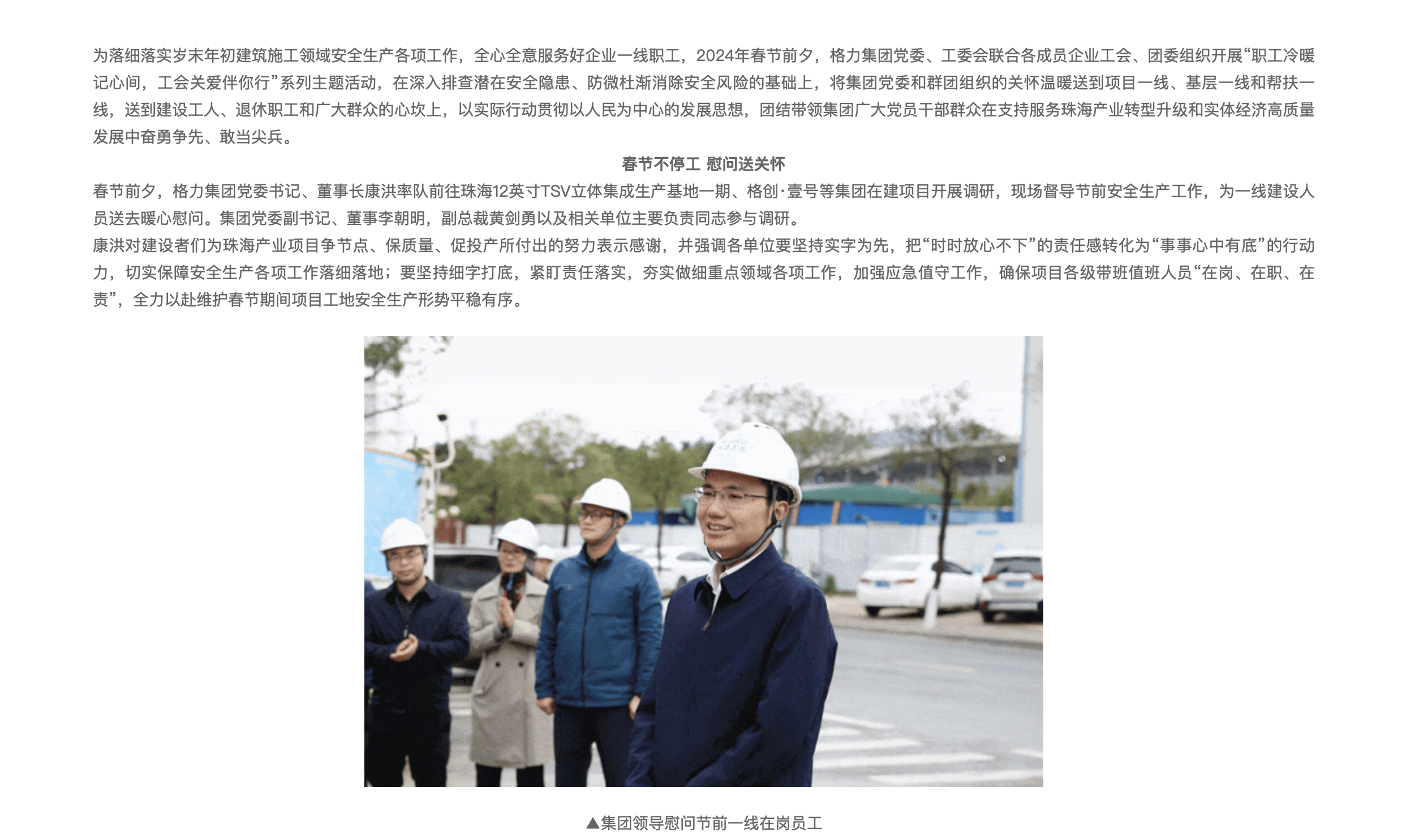上述报道介绍,春节前夕,格力集团党委书记、董事长康洪率队前往珠海12英寸TSV立体集成生产基地一期、格创·壹号等集团在建项目开展调研,现场督导节前安全生产工作,为一线建设人员送去暖心慰问。