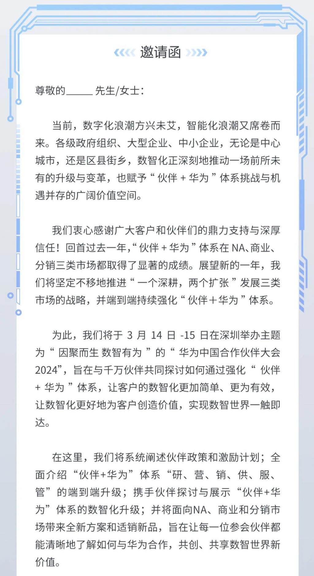 华为中国合作伙伴大会2024将于3月14日~15日在深圳举行