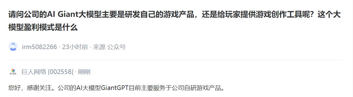 【大河财立方消息】2月20日,巨人网络在互动平台表示,公司的AI大模型GiantGPT目前主要服务于公司自研游戏产品。