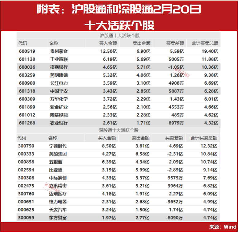 从北上资金、融资盘净买入的方向来看,也是以大金融板块为主。如2月19日和20日,在沪股通和深股通(北上资金)前十大活跃个股(见附表)中,银行板块的招商银行、农业银行、工商银行,保险板块的中国平安,以及券商板块的东方财富均位列其中。