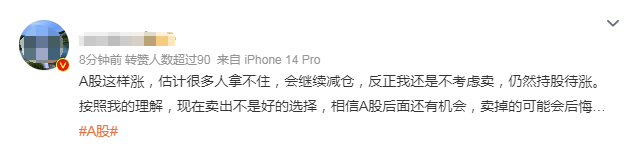 但看多A股后市的投资者似乎更多。如有投资者表示,“A股这样涨,估计很多人拿不住,会继续减仓,反正我还是不考虑卖,仍然持股待涨。按照我的理解,现在卖出不是好的选择,相信A股后面还有机会,卖掉的可能会后悔…”