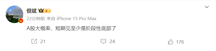 而对于A股市场当前的上涨,一向对盘面较少发表意见的东方港湾董事长但斌也公开表示,“A股大概率,短期见至少是阶段性底部了。”